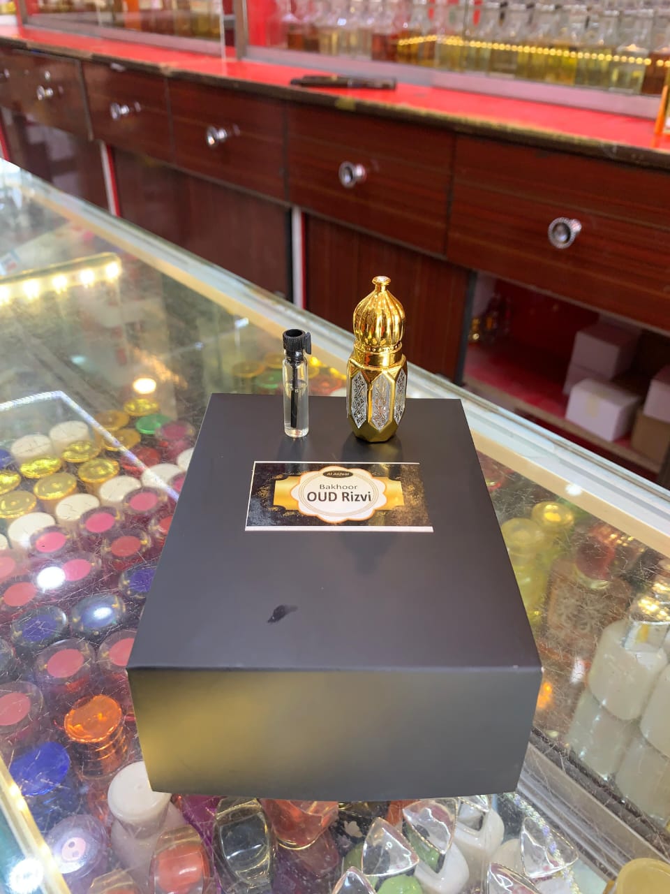 This exquisite set includes a rich and long-lasting Oud Rizvi attar alongside a finely crafted Bakhoor sample, offering deep, woody, and aromatic notes that linger beautifully.